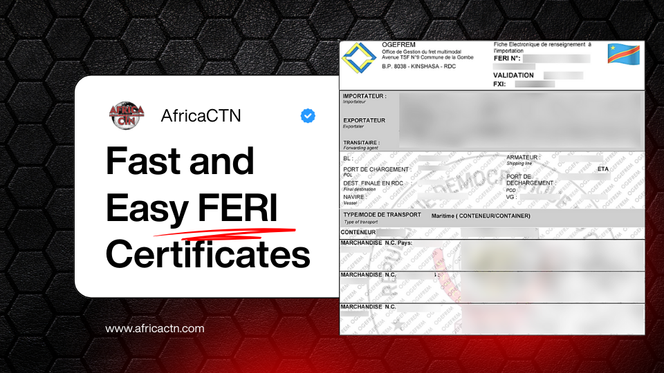 The FERI Document is a required waiver certificate for all imports into Democratic Republic of Congo. Without it, your shipments will face fines and delays at the destination port. AfricaCTN is the authorized agent and can help issue this document quickly and accurately.