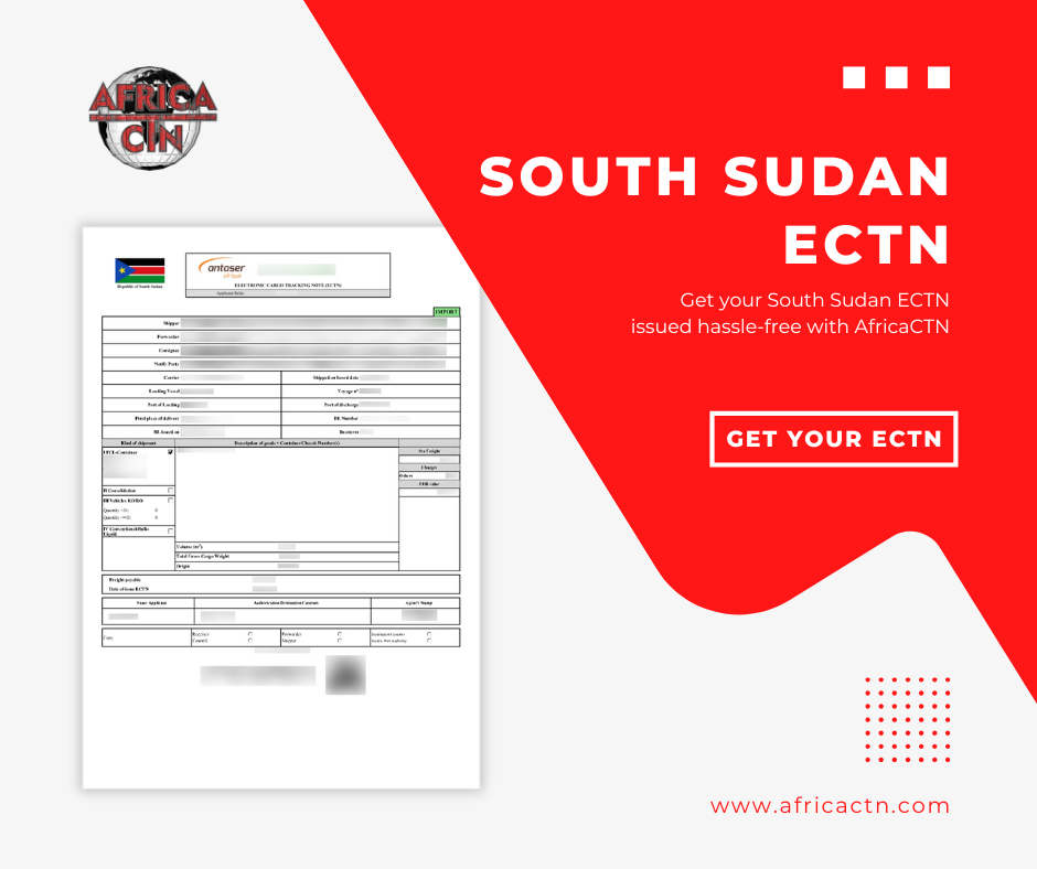 AfricaCTN is the authorized agent to issue the South Sudan ECTN. To apply you will need to submit the BL, commercial invoice, freight invoice and export declaration to AfricaCTN. We will then issue your draft ECTN, you will approve the details, pay the invoice and receive your final validated ECTN certificate.