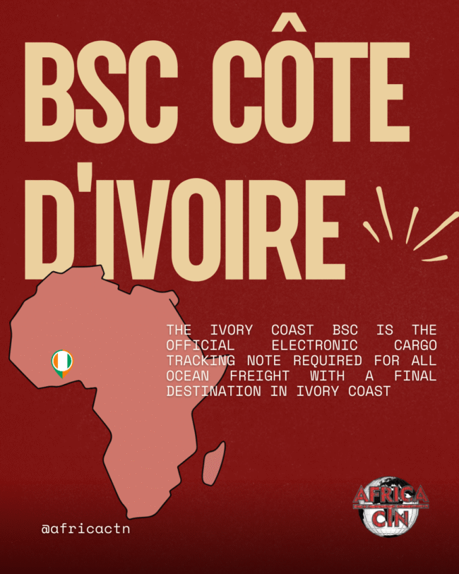 The Ivory Coast BSC is the official electronic cargo tracking note required for all ocean freight with a final destination in Ivory Coast (Côte d’Ivoire). This waiver certificate confirms that all cargo is properly declared and verified before arrival, which prevent delays, inspections and fines.